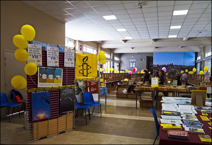 Près de la caisse où l'on ne déboursera qu'un euro par livre de poche choisi en farfouillant dans les dizaines de cartons, il y a la table des AU, les Actions Urgentes. Bien modestement j'y participe. C'est très facile, rapide à exécuter et parfois on reçoit une bonne nouvelle ; pas assez souvent c'est évident mais parfois quand même, ça aide à ne pas désespérer de l'humanité tous les jours quand on est du bon côté de la barrière. De l'autre côté, celui des barbelés, il arrive que des gens soient soutenus, libérés, sauvés, aient accès à un procès équitable en cas de besoin, à des soin, etc grâce aux Actions Urgentes bref qu'ils cessent de subir des traitements arbitraires "inhumains et dégradants" tels sont les mots utilisés.